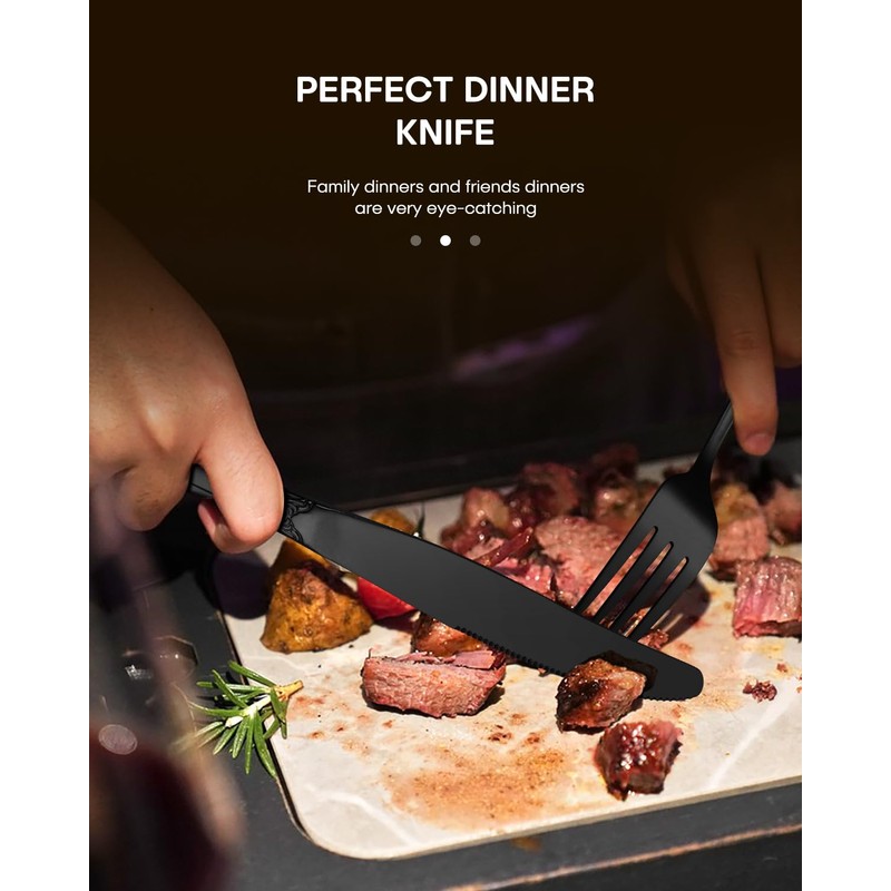 - COMFORTABLE AND ERGONOMIC: Great weight size of eating utensils, our black cutlery has a nice weight and perfect balance to them, not too heavy and not too light. Ergonomic delicate engraving handle well designed to provide good grip for both adults and big children. Moreover, the smooth edges ensure safety and no scratches. If you are looking for a unique and elegant set of silverware, then this set is your best choice