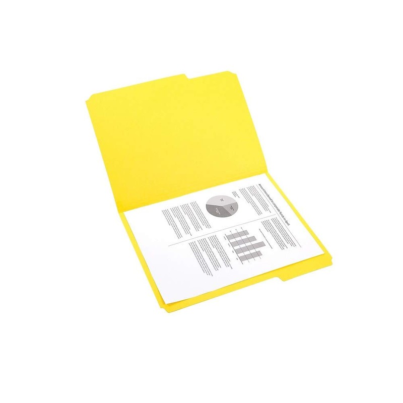 Secure letter and legal-size documents with this box of 100 Staples yellow file folders with reinforced tabs. Enclose important documents in these yellow file folders. Each folder in this 100-pack box features reinforced tabs in three positions for easy labeling and simple file identification. The classic yellow color provides high visibility and the standard-weight stock construction is durable for everyday handling. These Staples file folders are perfect for storing a wide range of paperwork thanks to the 0.75-inch expansion. Yellow in color and made of paper stock for durability. Three 1/3-cut top tabs allow ample space for labelling to keep your files organized. Letter-size folders hold important files with ease. 100 folders store and organize countless vital documents. Contains 10% total recycled content.