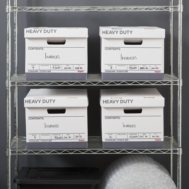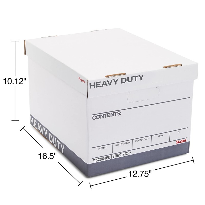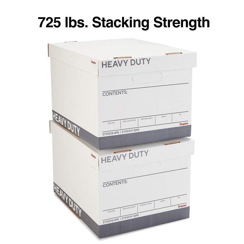 Staples Heavy-Duty Storage Boxes, Top Tab, Stacking Strength 850 lb, White/Gray, 9 3/4"H x 12"W x 15"D, 4/Ct