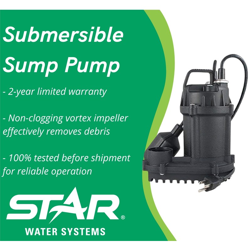 Star 3SDHL Cast Iron 1/3 HP Submersible Sump Pump with Tethered Float Switch, Passes 3/8" Solids, 54 GPM