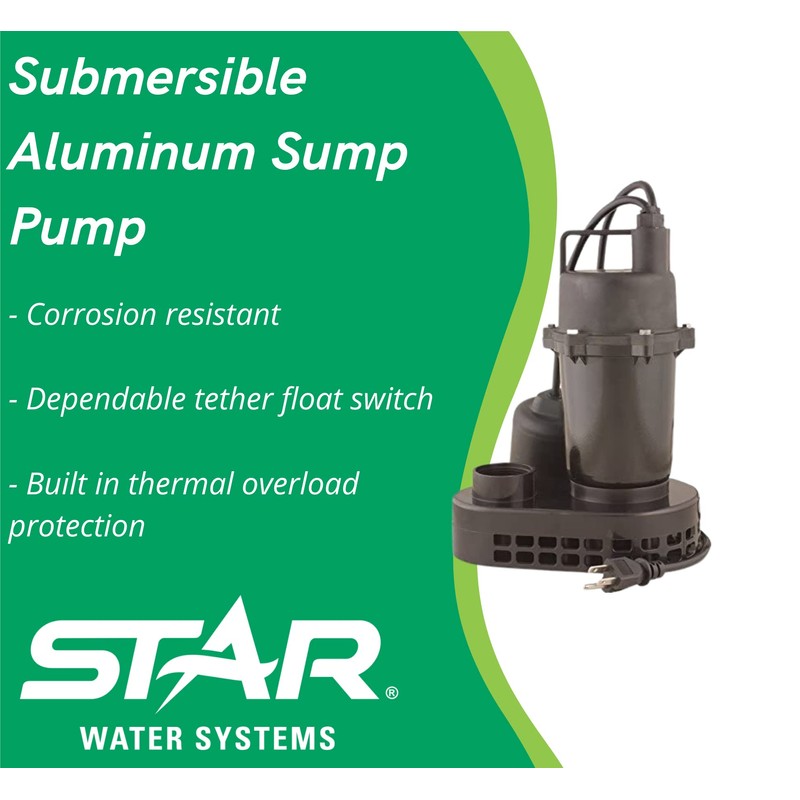 Star 3USPHLC 1/3 HP Submersible Aluminum Sump Pump with Dependable Float Switch, 4 Amps, 50 GPM