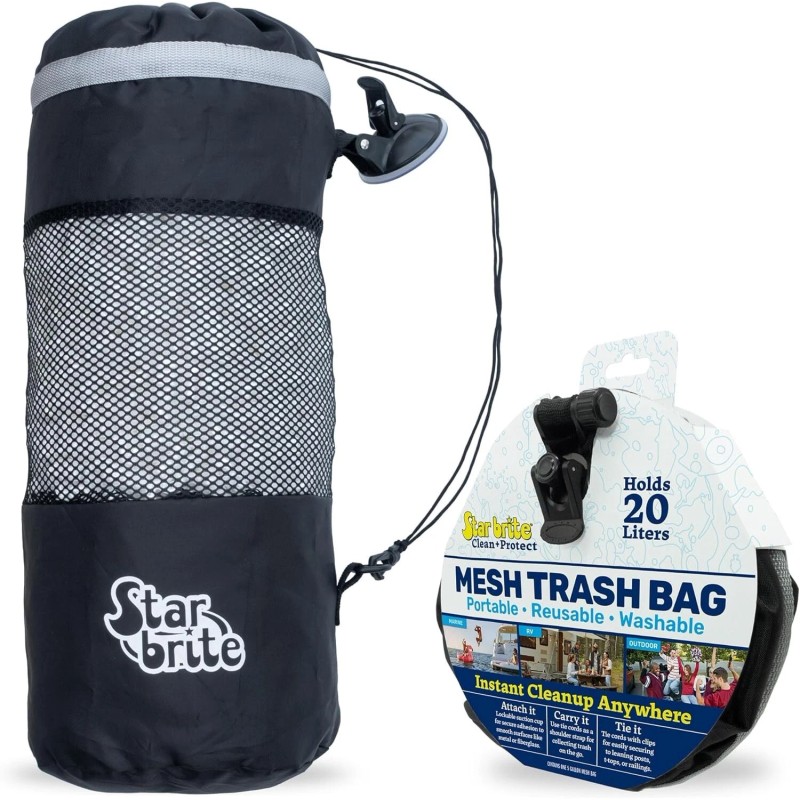 • Experience the ultimate in outdoor waste management with our Mesh Trash Bag. Perfectly designed for versatility, it's ideal for use on boats, RVs, golf carts, and during outdoor adventures. The locking suction cup guarantees a secure hold on smooth surfaces, while the oversized litter guard cinch ensures that trash stays put, even on windy days. Crafted from robust PVC and nylon, this bag is ready to face the elements. The durable mesh sides promote air circulation, warding off unpleasant odors. Cleaning is a breeze: just hose it down or give it a soak with mild soap, rinse, and let dry. For a tidier and more organized outdoor experience, our Mesh Trash Bag is the solution. It's perfect for boats, RVs, golf carts, picnic tables, tents, and outdoor events. Attach it to a backyard fence during a BBQ, use it as a portable trash bag in your workshop, or hang it on an apartment balcony railing.