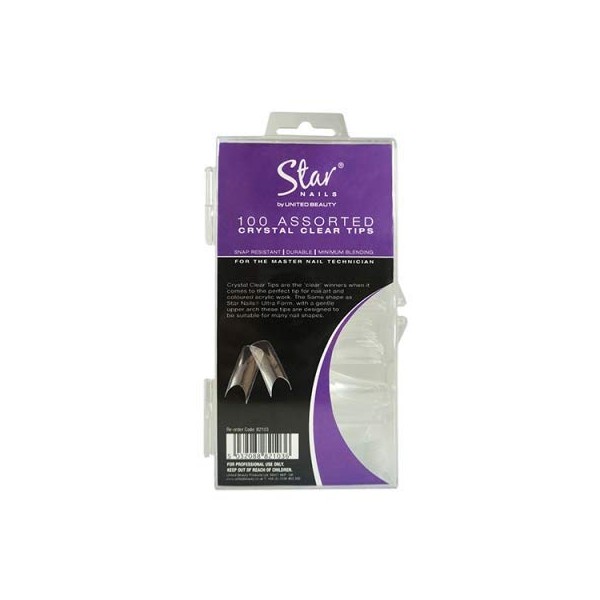 - Star Nails Crystal Clear Nail Tips 100 Assorted - Pack of 100 Crystal Clear Tips are the ‘clear’ winners when it comes to nail art and coloured acrylic work. The high fashion deep smile line offers maximum versatility and is designed to suit a variety of nail shapes.