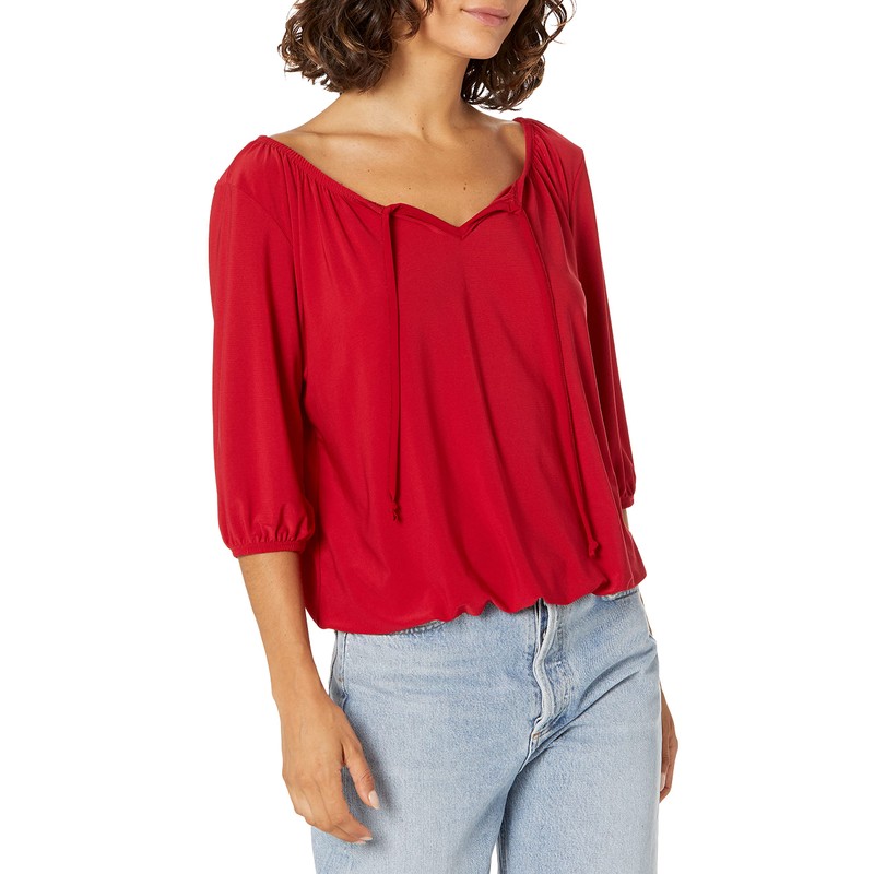 Star Vixen Women's Petite 3/4 Sleeve Peasant Elastic-Hem Keyhole-Tie Top, red, PS