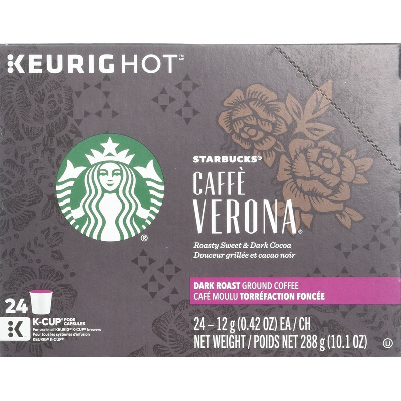 - FLAVOR AND ROAST: Starbucks Caffè Verona coffee is well-balanced and rich with a dark cocoa texture; Contains 4 boxes of 24 K-Cups each (96 K-Cups) of Starbucks Caffe Verona