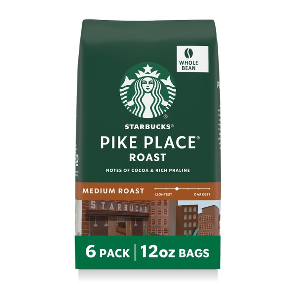 Starbucks Whole Coffee Beans, Medium Roast Hot or Iced Coffee, Pike Place Roast, Six 12 oz Bags