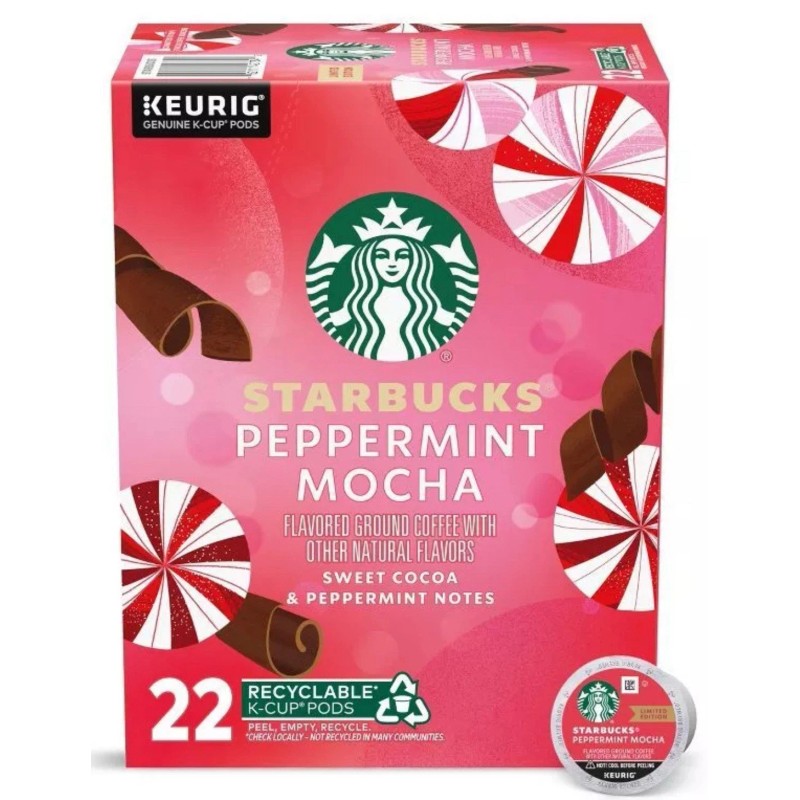 Indulge in the festive flavors of the Starbucks Peppermint Mocha K-Cup Coffee Pods with 22 servings per box.