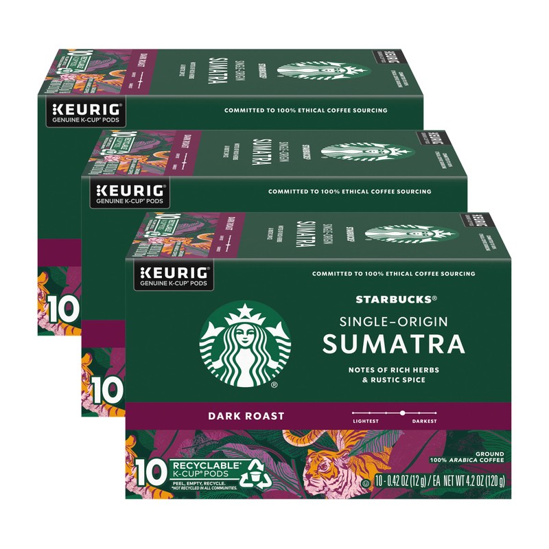 Starbucks Coffee K-Cup Pods, Single-Origin Sumatra Coffee, Dark Roast 100% Arabica Coffee, Keurig Genuine K-Cup Pods, 10 CT K-Cups/Box (Pack of 3 Boxes)