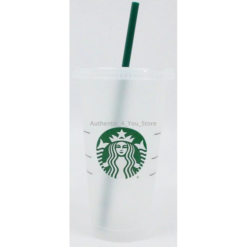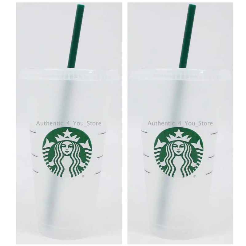 This listing is for TWO brand new Starbucks 24oz Reusable Cold Cups with matching lids and straws. The plastic cup features a frosted design and the Starbucks logo. The cup, lid and straw are all top-rack dishwasher safe.
