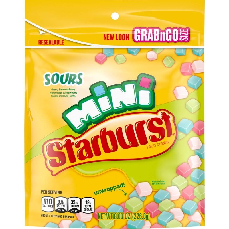 - CONVENIENT RESEALABLE BAGS: Each 8-ounce candy bag is resealable, making it easy to enjoy STARBURST Minis Sours on-the-go. Keep your chewy candy fresh and accessible anytime with the Grab N Go size