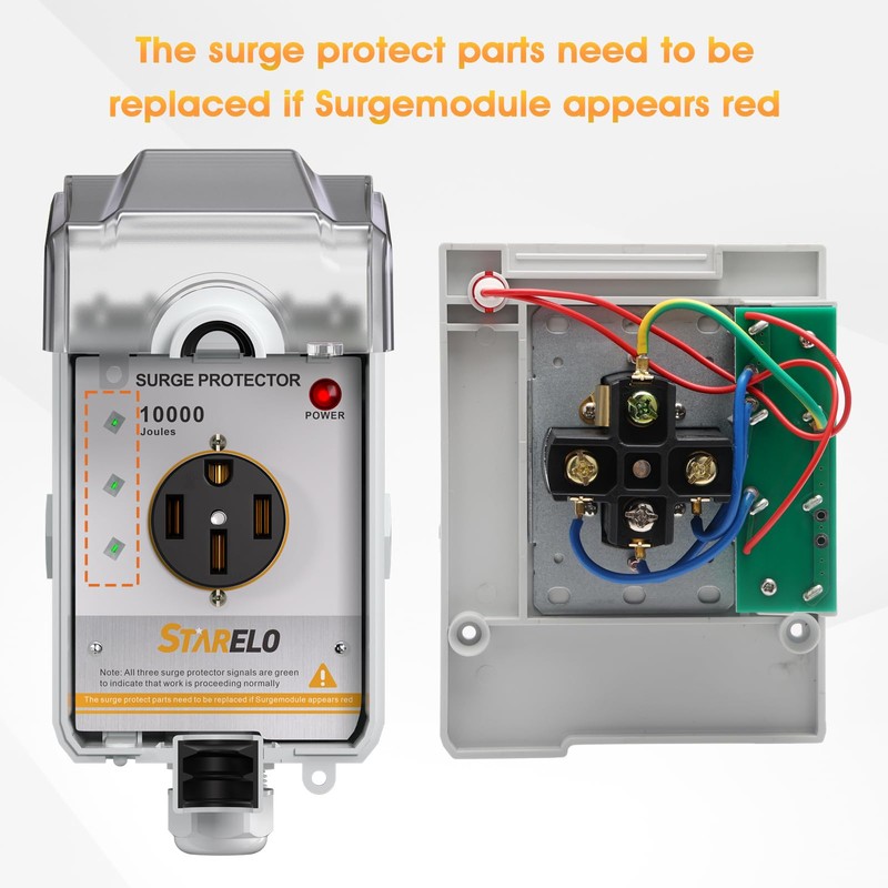 Title:STARELO 50Amp RVPower Outlet Box with Surge Protector Waterproof(10000 Joules),NEMA 14-50RReceptacle 125/250Volt,With Surge Protection for RV Campers and Van Trailers,ULListed.(NEMA 14-50R Box)
