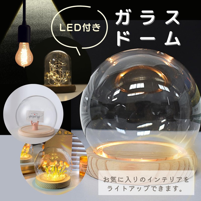 Clear Glass Dome Size: 4.7 x 4.7 inches (12 x 12 cm), 3.9 x 7.5 inches (10 x 19 cm), 5.9 x 7.2 inches (15 x 18.5 cm), 6.0 x 11.8 inches (15 x 15 x 20 cm); Glass Dome with LED light: A stylish design that is perfect for interior decoration. Store your favorite collection in the dome At night, you can light up by turning on the LED. Store it inside the dome to protect your collection from dust and other elements while providing interior decoration. Fashionable Collection Case: Perfect for displaying dried flowers, preserved flowers, figures, watches, and more. (Oak Base with Stand) The natural oak style is designed to blend in with the interior. The base is equipped with 3 stands, and the height is elevated for an excellent design. (High Transparency Glass Dome) The non-fog glass dome enhances the quality of your collection. "