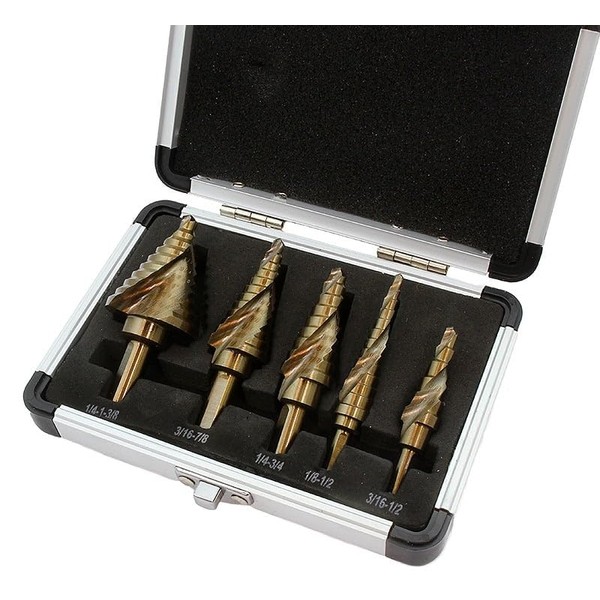 Stark 5-Piece Set SAE Spiral Grooved Step Drill Bit Set, High-Speed Steel & Titanium Nitride Coating, Two-Flute Design, Storage Case