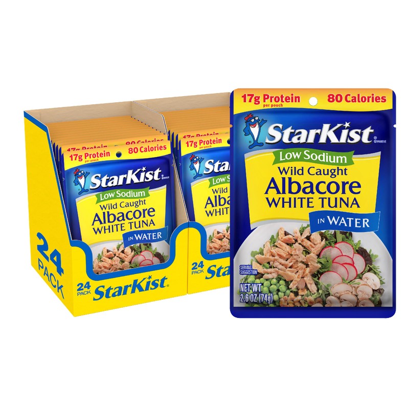 StarKist Low Sodium Albacore White Tuna in Water, 2.6 oz Pouch (24 Pack) Ready to Eat Wild Caught Tuna, 17g Protein, 80 Calories Per Serving, Gluten Free, Soy Free, Kosher, Perfect for Meals & Snacks