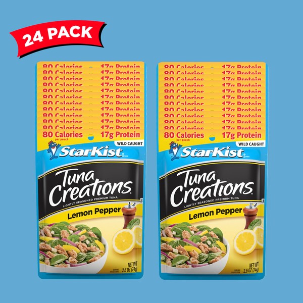 Whether you're squeezing in lunch between meetings during a busy workday or want a quick, protein-packed snack between soccer practice, school and other daily errands, StarKist Tuna Creations Lemon Pepper Pouch is the perfect choice! These 2.6oz pouches start with our premium wild caught tuna and are the perfect addition to salads, sandwiches, pasta or even straight out of the pouch. Plus, this nutrient dense tuna pouch is soy and gluten free and works well with Keto, Mediterranean and Weight Watchers diet plans! Our flavor fresh tuna pouch preserves the freshness of your favorite meal or snack, so it's always delicious and ready when you are. There's no can opener required or draining necessary C Just tear, eat and go! This packaged tuna is an excellent, natural source of protein and Omega 3s , and it has 17g of protein and 80 calories per pouch. Plus, it's a great, quick and easy way to add seafood to your diet! Tuna is naturally lower in fat and cholesterol, so it's a wholesome way to add variety to your meals. Easy to store, you can stock up with this 24-Pack, and keep these tuna singles in your office, pantry at home and even in your diaper bag or car! An industry innovator, StarKist was the first brand to introduce StarKist single-serve pouch products, which include Tuna, Salmon and Chicken Creations, and StarKist Selects E.V.O.O. As America's favorite tuna*, StarKist represents a tradition of quality, consumer trust and a commitment to sustainability. *Nielsen Custom Scantrak Data xAOC Dollar Share Latest 52 Weeks