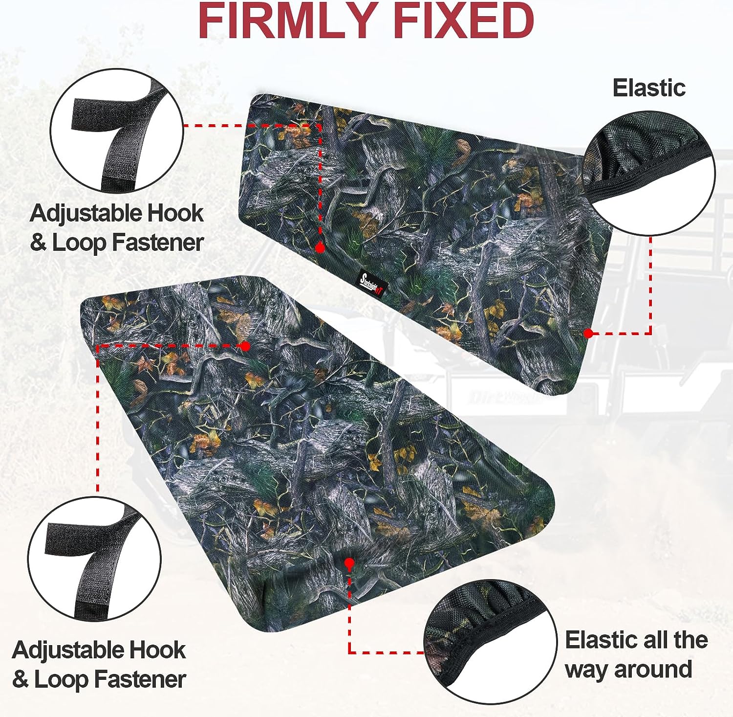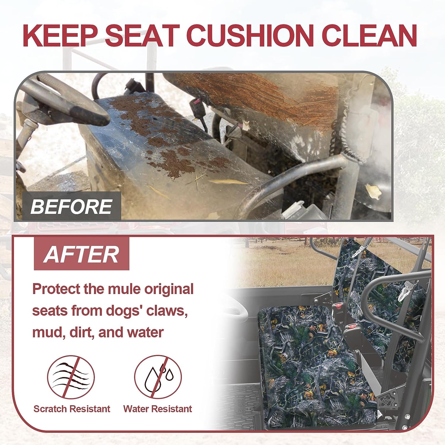 - 【Adjustable Design】The mule pro fxt seat covers, features an elastic band along the cover’s edge, 2 sturdy sticky straps on bottom seat cover and 2 hook and loop fasteners on the back seat cover, providing a quick and custom-like fit, which will help the seat cover set match your UTV seat cushion firmly.