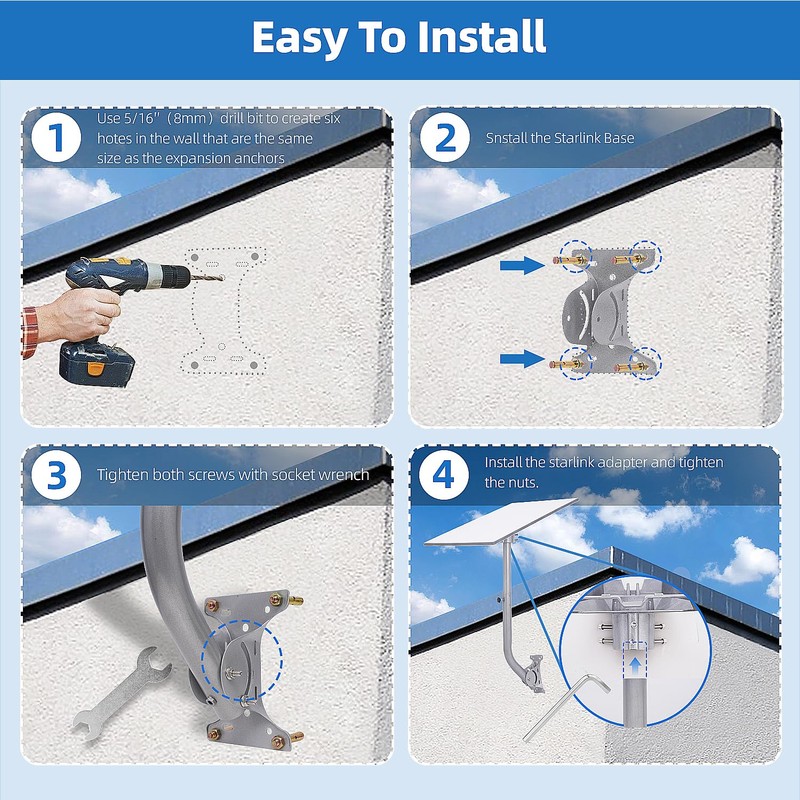 - 【 Complete Set for Easy Installation】Adjustable Gen 3 mount for seamless installation on walls, roofs, or any flat surface, providing optimal positioning for your Starlink satellite dish.Just mounting base on wall or roof and tighten screws with wrench, then inserting the Starlink Gen3 bracket into the dish slot, connecting the Starlink V3 Adapter to the pipe at last.