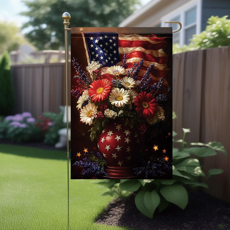- Vibrant Patriotic Design: This 12x18 inches garden flag features a striking floral arrangement in a star-embellished red vase, with an American flag prominently displayed, perfect for adding a patriotic and vibrant touch to your garden or home decor.