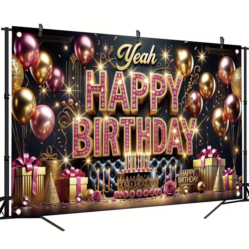 Starlit Patio Gold Pink Birthday Backdrop Banner 71" x 43" with Rope, Polyester Material, Happy Birthday Sign, Sparkling Text, Reusable, Washable, Suitable for All Ages