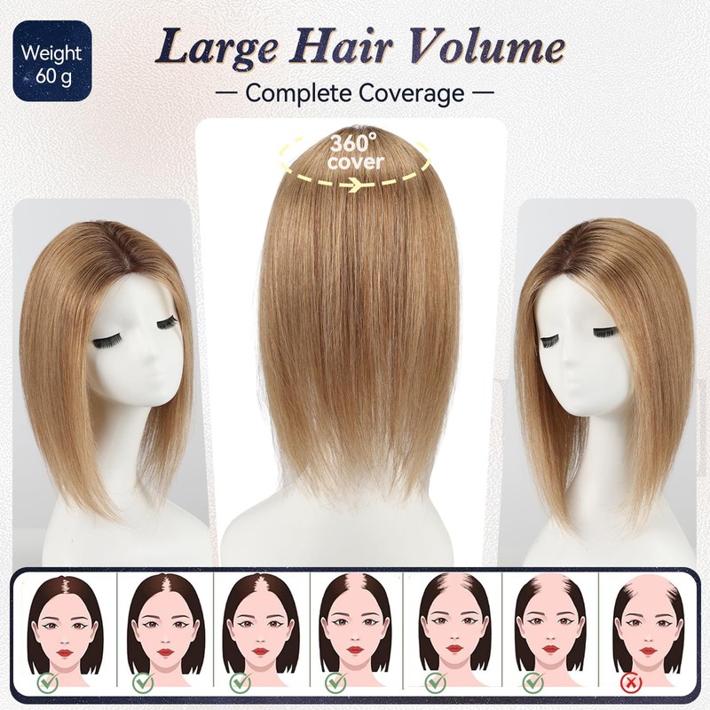 - 6 x 5 inch large area swiss base: Can meet the needs of most people; 6 x 5 inch Larger Base, suitable for mild hair loss, moderate hair loss, progressive hair loss patients; Hair toppers are the perfect option for women who want to increase their hair volume for beauty, either women with thin hair or those who just want to change their hairstyle; You will gain a natural fluffy hairstyle