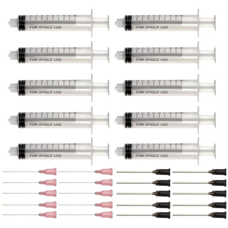 • This is a set of 10 syringes, and the needle tips are 2 sizes (20 pieces total). The needle tip is not sharp, so it is not suitable for piercing. Threaded needle tip reduces chance of leakage.
