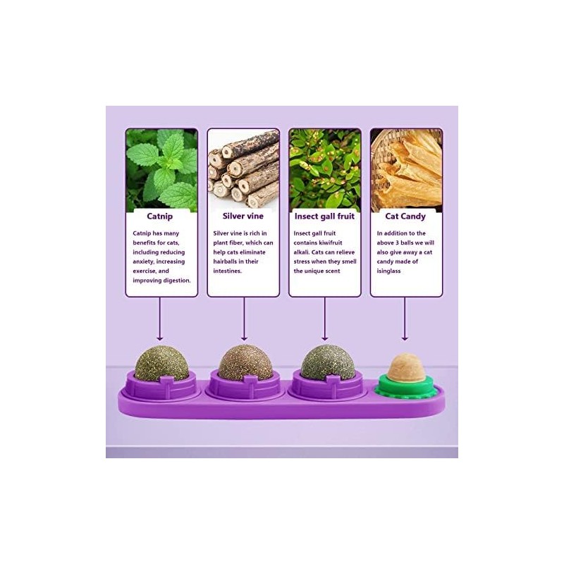 - 3+1 Flavors: 1 catnip ball, 1 silver rattan ball, 1 silver rattan fruit ball, 1 candy The selection of different flavours can meet the needs of different cats, and can also be shared by several cats