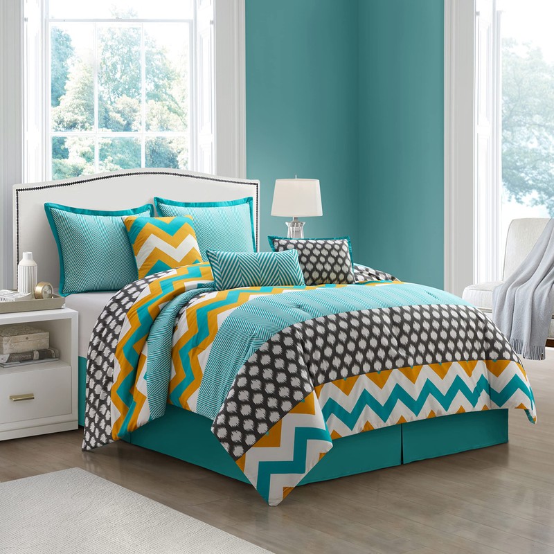 - Set Includes: (1) Comforter, (1) Bedskirt, (2) Pillow Shams, (3) Decorative Pillows