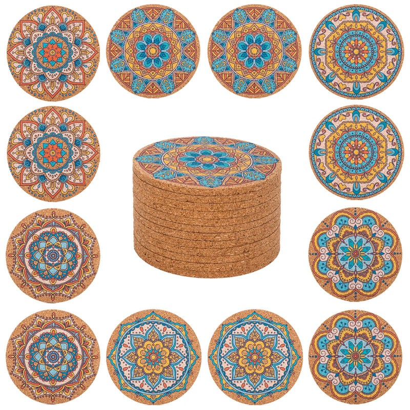 - What's in the box: Our coasters for drinks absorbent set includes 12 round cork coasters. The coaster is 10cm in diameter and 0.5cm in thickness. 6 patterns to choose from to make a beautiful addition to any room’s decoration