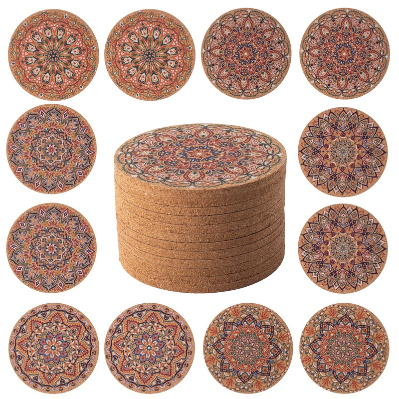 - What's in the box: Our coasters for drinks absorbent set includes 12 round cork coasters. The coaster is 10cm in diameter and 0.5cm in thickness. 6 patterns to choose from to make a beautiful addition to any room’s decoration