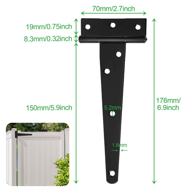 - High-quality material: the shed hinges are made of sturdy iron and the surface is galvanised surface, strong, rust-proof, durable and the T-hinge is not easy to bend, rust-proof even outdoors.