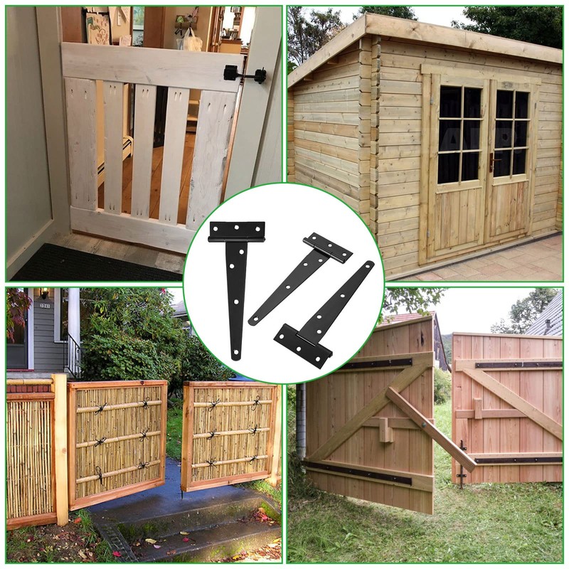 - Versatile Application -- The T-hinge can be suitable for use in doors, sheds, windows, gates, barns, fences. Widely used in all kinds of outdoor and indoor buildings, hangar door, barn door, shutters, skylights and especially good for cabinets and small projects.