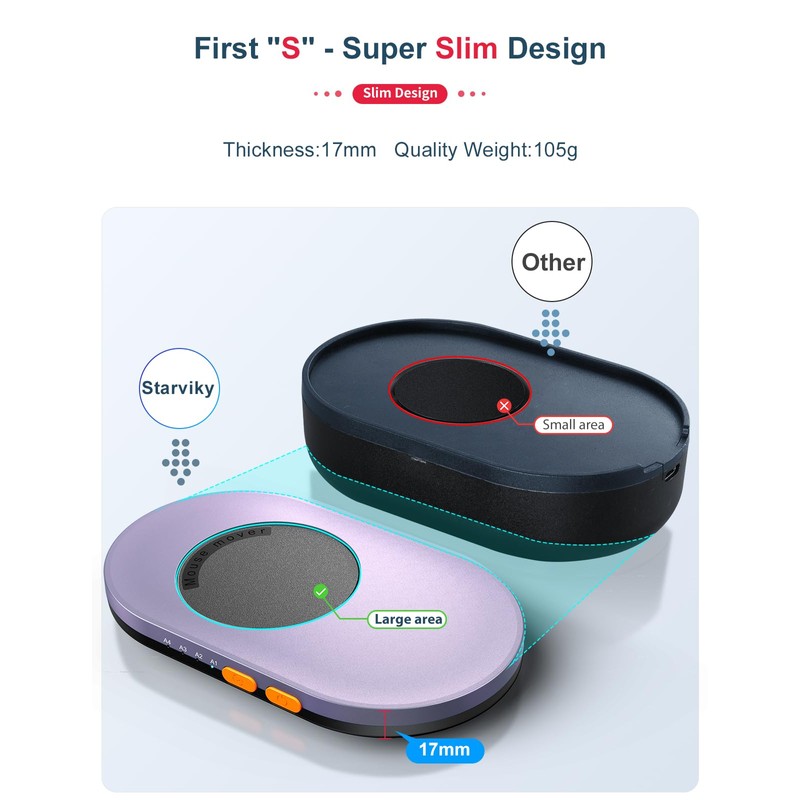 - 【Super Slim】 Different from the huge and bulky mouse shaker that is conspicuous in the market. We developed this ultra-thin mouse shifter. Its thickness is only 17 mm. Ultra-thin and stylish, it is not only inconspicuous but also helps to save desktop space.