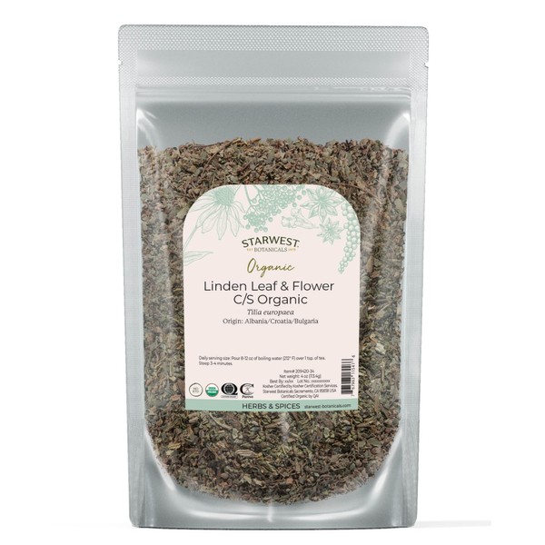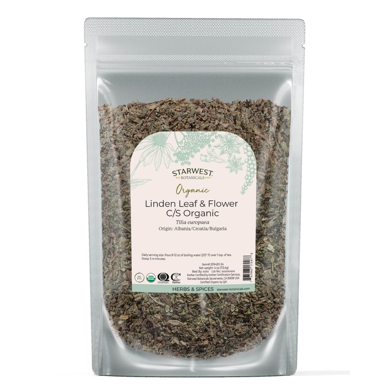 Starwest Botanicals Organic Linden Leaf & Flowers - Dried Loose Leaf Herb for Tea, Syrup, & Herbal Blends, Pure & Natural Linden, Caffeine Free, Cut & Sifted, Certified Kosher, Non-GMO - 4 oz Pouch