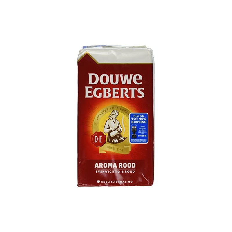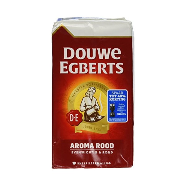 Ground Coffee in vacuum pack. Net 17.6oz/500g Douwe Egberts Aroma Rood coffee is one of the most popular in Europe. Aroma Rood is characterized as aromatic, smooth, and rich with perfectly balanced flavor and acidity. Many drink it without milk or sugar (even when they normally use milk and sugar) because of Aroma Rood's own special sweetness. The combination of strong Robusta beans and aromatic Arabica beans come together in a symphony of flavor through the Douwe Egberts' roasting process. Medium Roast Strength Level: Medium, 3 out of 5 Medium Coarse Grind Imported from Europe