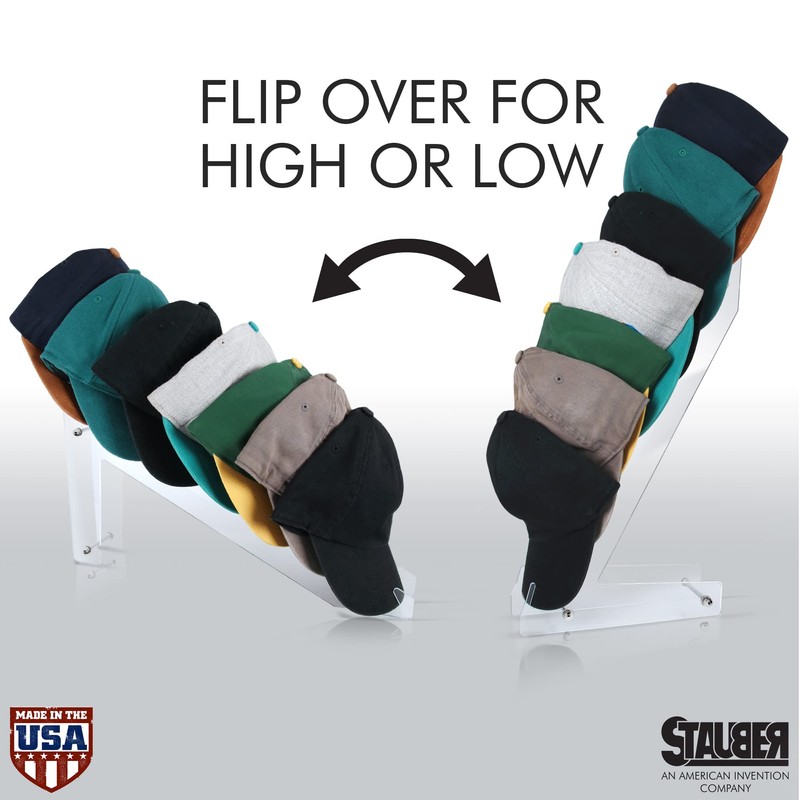 - Made in the USA! The STAUBER Best Hat Rack puts your awesome hat collection on display! Organize your hats how you want. We made this hat rack for household and commercial use. Set it up on your dresser or hang it in your closet with the included mounting hook. It's designed to work in both directions! Do you sell hats in your store? Use this as a display and set it anywhere you’d like.