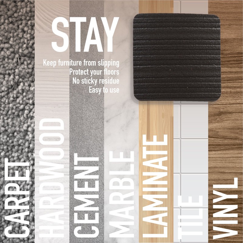 - SQUARE ANTI-SLIP FURNITURE GRIPPERS: Stay! Furniture Grippers are a simple but effective solution to your furniture slipping problems. Our furniture gripper pads stop your furniture from slipping, so you stop worrying about constantly moving your couches and chairs back to where they belong. The pads in this set of 4 are square, but we offer round pads as well.