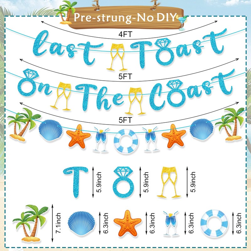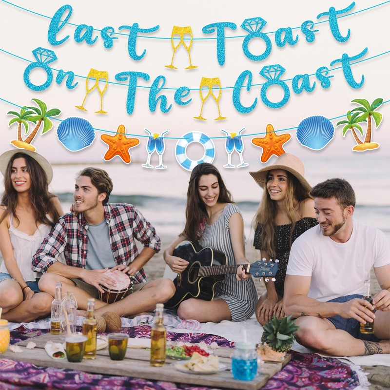 - 【Beach Party Vibes】This "Last Toast on the Coast" blue banner features festive tropical icons like wine glasses, rings, palm trees for bachelorette party decorations that capture a vibrant coastal bach atmosphere.