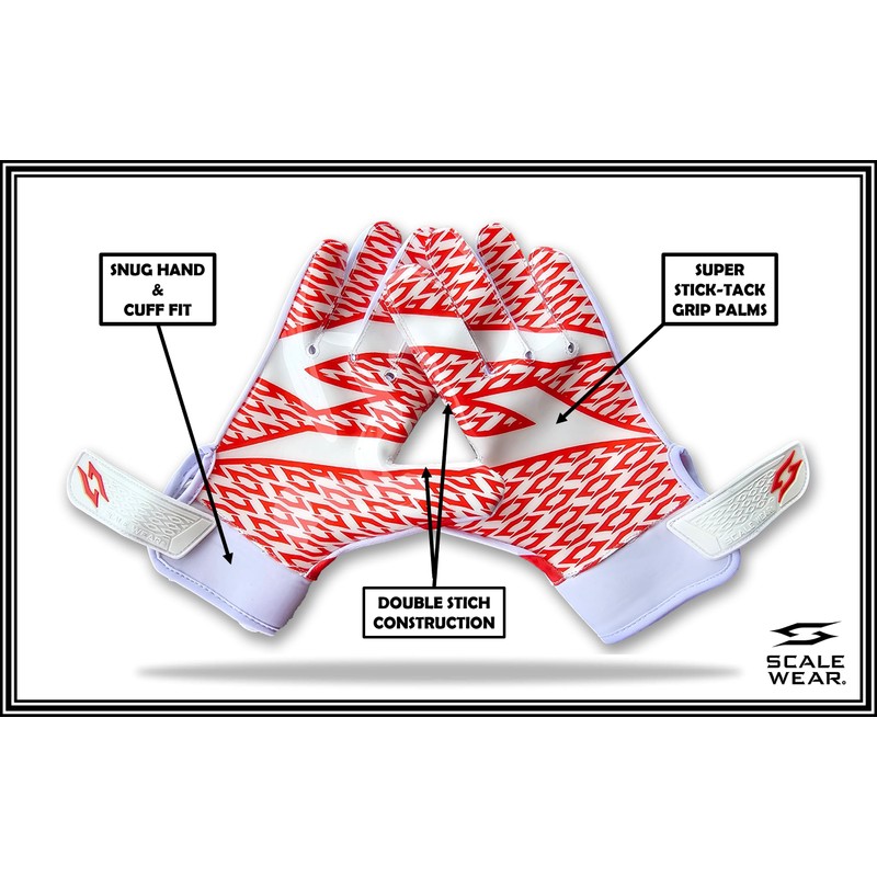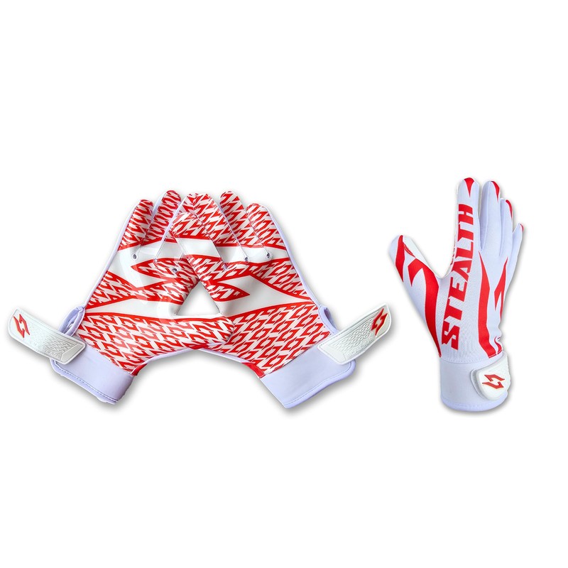 Boost your game with Tach Grip Scale Wear STEALTH football receiver gloves. STEALTH football receiver gloves are an exceptional all-around, highly durable glove with super sticky grip silicon palms. Wide Receiver Quaterback Football Gloves. We have both black football gloves and white football gloves with various other colors.