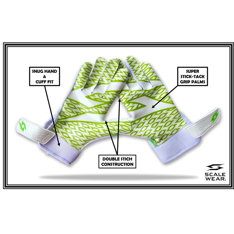 Boost your game with Tach Grip Scale Wear STEALTH football receiver gloves. STEALTH football receiver gloves are an exceptional all-around, highly durable glove with super sticky grip silicon palms. Wide Receiver Quaterback Football Gloves. We have both black football gloves and white football gloves with various other colors.