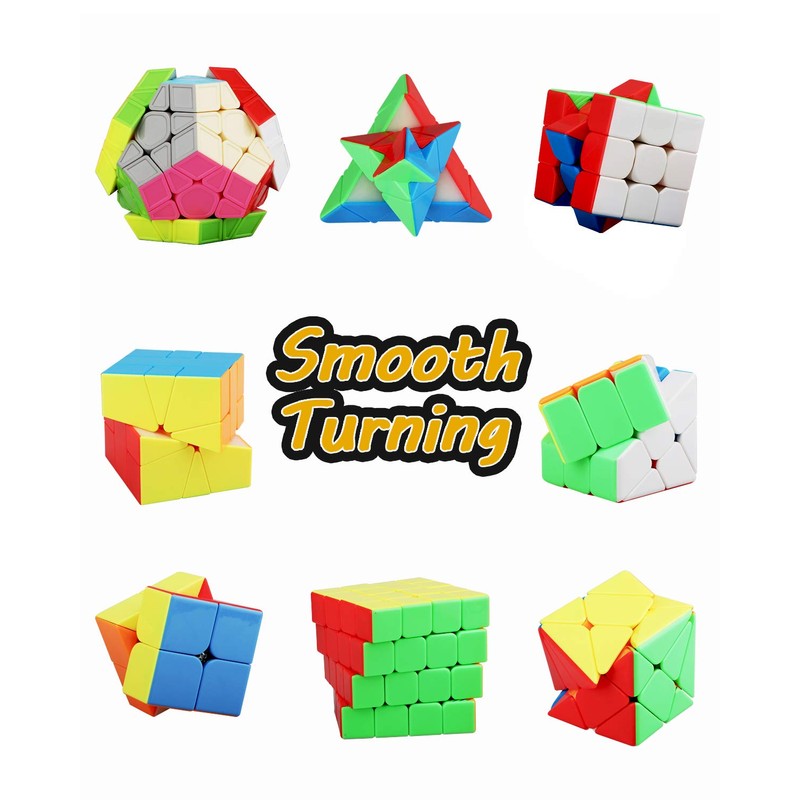 This speed cube bundle set comes with 3x3 speed cube / 2 by 2 speed cube / pyraminx speed cube / megaminx cube / 4x4 speed cube / skew cube and bonus cubes giving 8 different forms of fun.