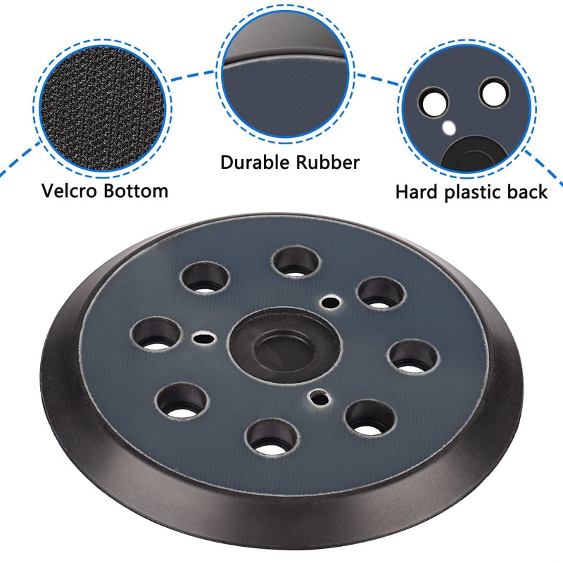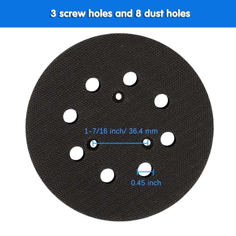 - Replacement pad: The 5 inch replacement pad with Velcro closure has 3 screw holes and 8 dust holes, fits most sanding pads, the distance between the centre to the centre of the screw holes of the pad is 1-7/16 inches