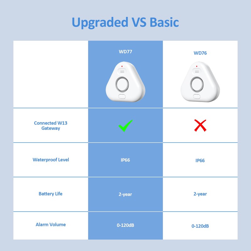 - NOTEDue to technology upgrade, only the water leakage sensor with model WD77 can be paired with the 2.4GHz smart wifi gateway, while classic model WD76 without wifi and bluetooth function is unable to connect to 2.4GHz Gateway W13. Please identify carefully and confirm your needs before purchasing. Upgraded WD77: B0DPMGN3TS/B0DXF39PGH/B0DPMCSB5B/B0DPM4PYHJ(, can be adapted to 2.4GHz WIFI). Classic WD76: B0DR1JB7FF/B0DR1CKD77(, not WIFI compatible)
