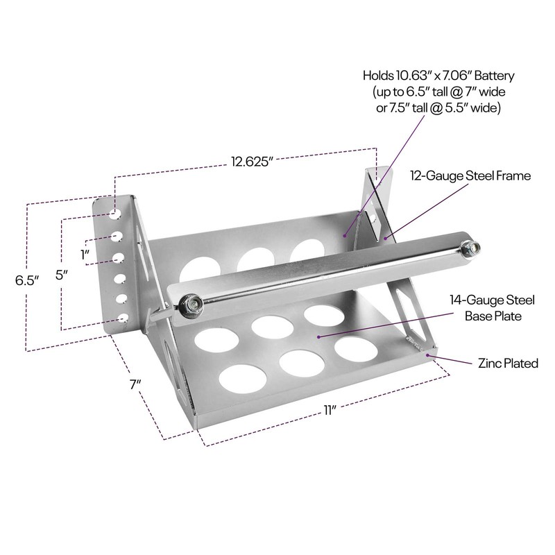 - Will hold a battery up to 10-5/8" x 7-1/16" up to 7-1/2" high