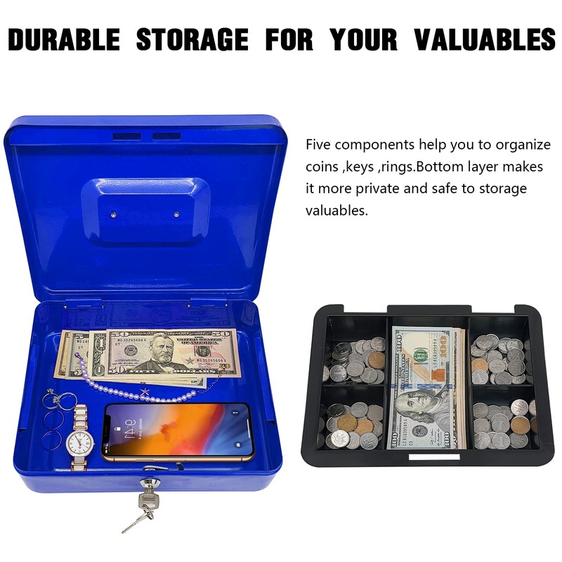 Steel Cash Box with Key Lock, Metal Small Money Organizer with Money Tray,Cash Storage Box with Lockable Cover (Blue - 10 inch)