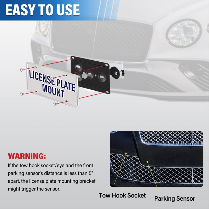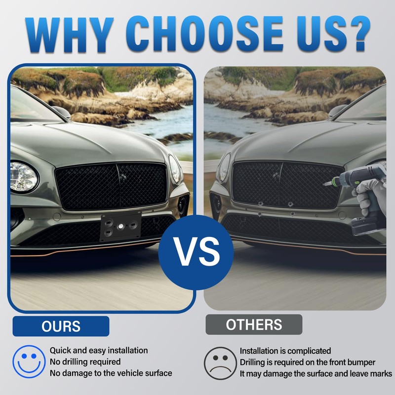 - No-Drill Easy Installation - Equipped with 4 adjustable mounting points, allowing car owners to customize the license plate position freely to avoid blocking vehicle air intakes, headlights, or parking sensors. No drilling or vehicle modification is required, and secure installation can be completed in minutes, catering to car owners' need for convenient installation.