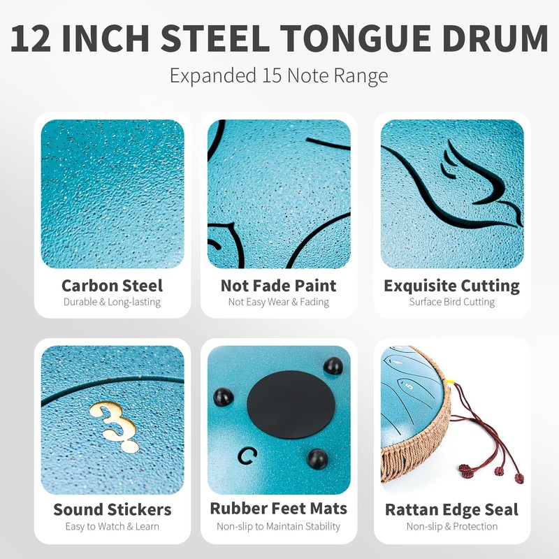 - Expanded 15 Note Range: 12 inch tongue drum consists of 15 notes and has been meticulously hand-tuned by artisans, it can be produce a harmonious, soothing C major scale tone. The handpan drum has middle, high, and low range can meet the needs of professional players and is also suitable for beginners