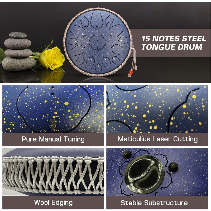 - Our latest Auspicious cloud style 14''-15 note Steel Tongue Drum with water-based environmentally friendly paint which is pollution-free and does not fade.Comes with a carry bag for convenient transport, you can bring the drum with you wherever you go.