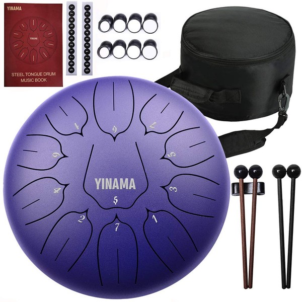 Yinama Steel Tongue Drum 11 Notes 12 inches lotus flower style. There are no wrong notes, you will be played enough beautiful overtones by Hitting with your hand or drum mallets.Protective lacquer finish guards against tarnishing, scuffs, and scratches.Silicone feet stabilize the drum's position during playing. Great for Camping, Yoga, Meditation, Music Therapy snd parties. And also can be used a interior decoration to make your indoor nice and cozy.Package Included:1 x Steel Tongue Drum2 x pairs of Drum Mallets1 x Music Book (with Instructions)2 x set of Notes Stickers8 x Picks1 x Bag