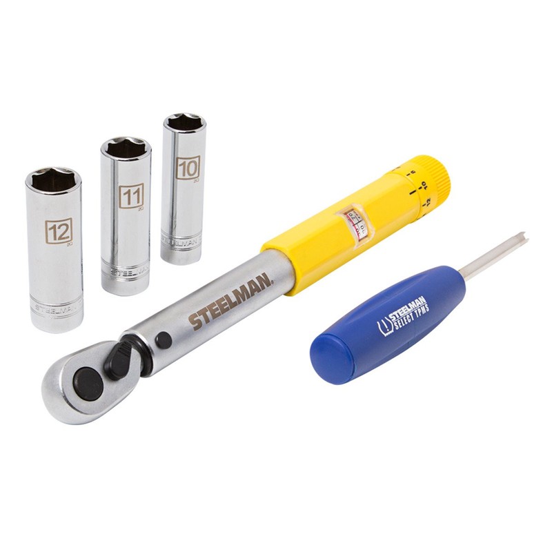 Be prepared to work on any car that comes into your shop with this must-have TPMS Basic Service Tool Kit! This kit includes all of the essential tools required to properly service and maintain valve stem TPMS sensors. The 1/4-Inch Drive Micro-Adjustable Torque Wrench features a range of 30-150 Inch- pounds, and properly torques TPMS hex nuts to ensure a proper seal and fit of TPMS sensors. The pre-selected torque setting ensures you don’t over or under- tighten hex nuts to get a proper seal and fit of TPMS sensors. With the Valve Core Torque Tool, you can safely remove and install TR C1 valve cores into all TTV and TPMS tire valves to meet manufacturers' requirements for proper torque specifications of 4 Inch-pounds. The kit comes also with three deep chrome sockets that are commonly used on sensor-retaining nuts. When you’re ready to pack up for the day, the items can be stored in the included zip-around case. (Colors May Vary) STEELMAN is an industry leader in automotive and industrial specialty tools and equipment, manufacturing the highest quality, unique, and innovative tools and products, designed to meet the specific needs of mechanics, contractors, and other working professionals.