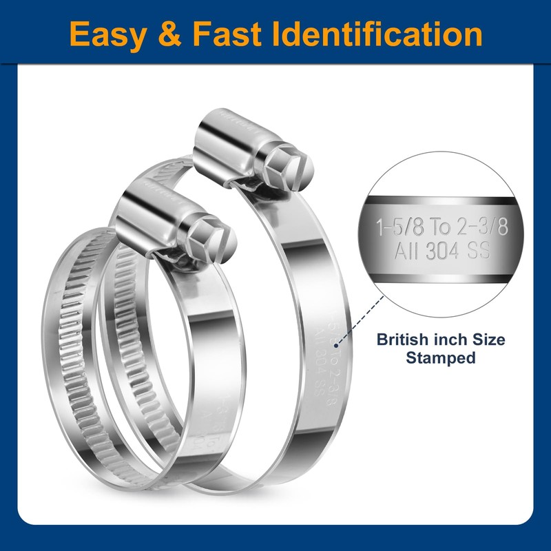 - Non-Metric Sizes: All 5/16" HEX head for our hose clamp kit. Use either screwdriver or nut driver for fast twist. British diameter marked on band for easy identification when using! No need to stock metric and SAE size hose clamps separately.